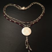 Sterling silver earrings with 2 rectangles of rock crystal and beads of red garnet and silver, suspended from figaro chains and secured on a silver curled ear wire with a bobble