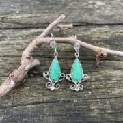 A stunning deep blue oval labradorite sits on one side of this sterling silver swirly necklace. On the other side a smaller round labradorite stone and to the lower centre a pear shaped stone dangles to catch the light. Silver chain suspends this piece and it it is secured with a lobster clasp. This necklace sits beautifully flat on the decolletage and is a real statement piece.